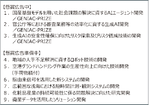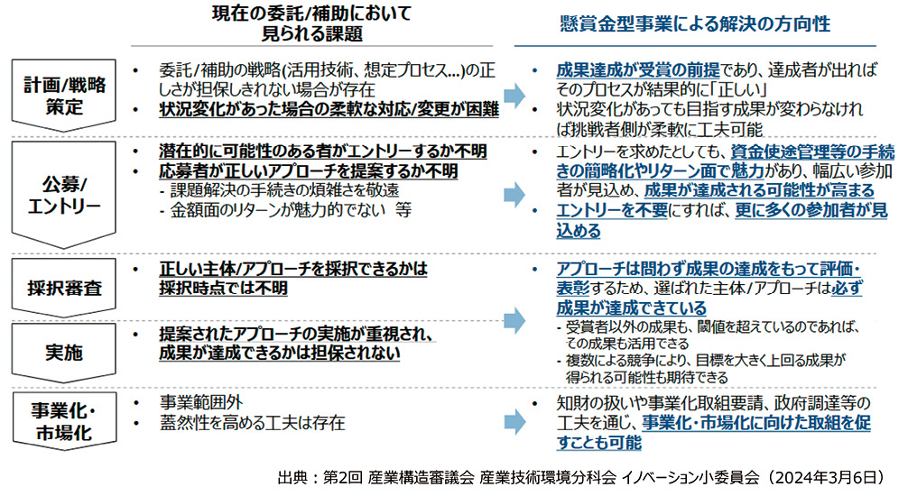 イノベーションを創出し、その恩恵を社会課題の解決によって国民や社会に還元していくためには、従来にない先端技術を社会実装に至らしめるための適切な方策を推進することが重要である。「イノベーション小委員会中間とりまとめ」(2024年6月21日、産業構造審議会 産業技術環境分科会 イノベーション小委員会)では、現在の委託型や補助型で実施してきている国の研究開発事業について、状況変化があった場合に柔軟な対応・変更が困難であること、潜在的に可能性のある者がエントリーするか・応募者が正しいアプローチを提案するか不明であること、正しい主体・アプローチを採択できるかは採択時点では不明であること、提案されたアプローチの実施が重視され、成果が達成できるかは担保されないことなど、研究開発事業の目標が複雑化・高度化している中でいくつかの課題も存在することを指摘し、研究開発の成果に報酬を支払う仕組みである「懸賞金型事業」については、アプローチを問わず成果の達成が受賞の前提であり、これを本格実施することとしている。