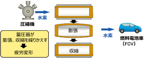 水素ステーションでは、外部から運搬された水素を圧縮し、蓄圧器に高圧で蓄える。蓄圧器は多くの圧力変動が生じるため、寿命は10万回以上とされている(図1)。