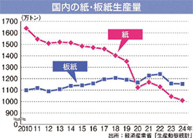 経済産業省によると、印刷・包装用紙といった紙の2024年の国内生産量は1,008万トンと19年比25%減少し、22年比でも11%減った(図1)。コロナ禍を経て除菌向けなどの衛生用紙の消費は高止まりしているものの、需要全体の減少に歯止めがかからない。段ボールなどに使う板紙が、安定的な物流需要を支えに横ばいで推移するのとは対照的だ。