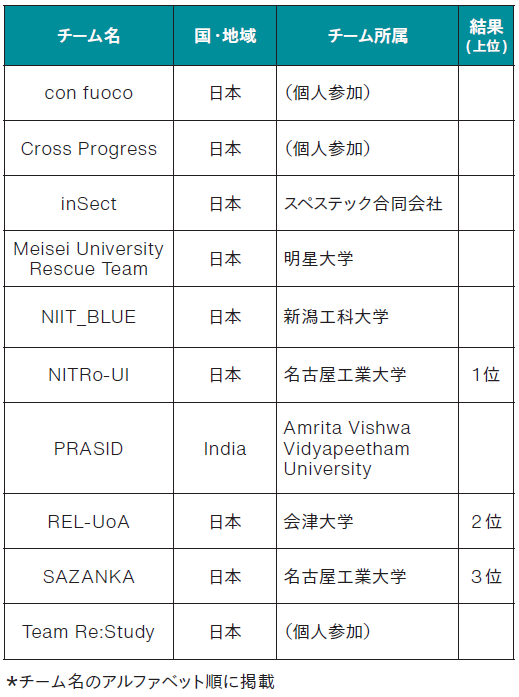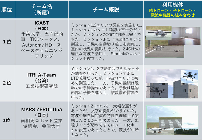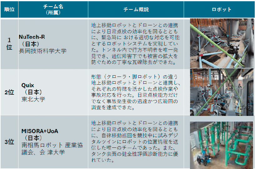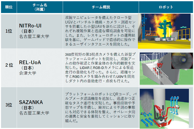 1位のNuTech-Rチームは地上移動ロボットとドローンの連携により日常点検の効率化を図るとともに、緊急時の適切な対応可能なロボットシステムを実現、行方不明者を唯一発見して、通信障害の中で瓦礫除去を行った。2位のQuixチームもグラウンドロボットとドローンを連携させた。