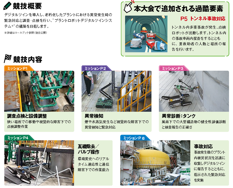 化学プラントや工場施設における異常検知と緊急対応を模擬した競技である。デジタルツイン技術を活用し、リアルタイムでプラント状態を監視しながら、ロボットによる点検、異常検知、診断、事故対応を行う。狭隘空間での作業能力や、煙・蒸気などの視界障害下での操作性が試される。