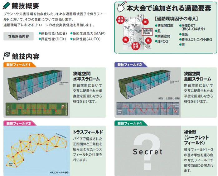 ドローンの基礎性能を客観的に測定し、標準化を推進する競技である。操縦性、器用性、マッピング能力、自律性の4つの基礎性能を、4つの異なるフィールドで評価する。狭隘空間、風、煙、雨、電波障害などの過酷環境要素が導入され、実用的な性能評価が行われる。