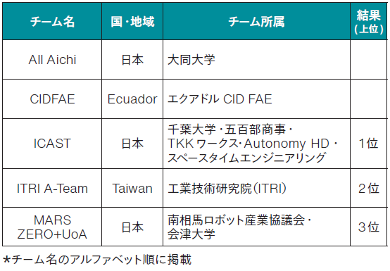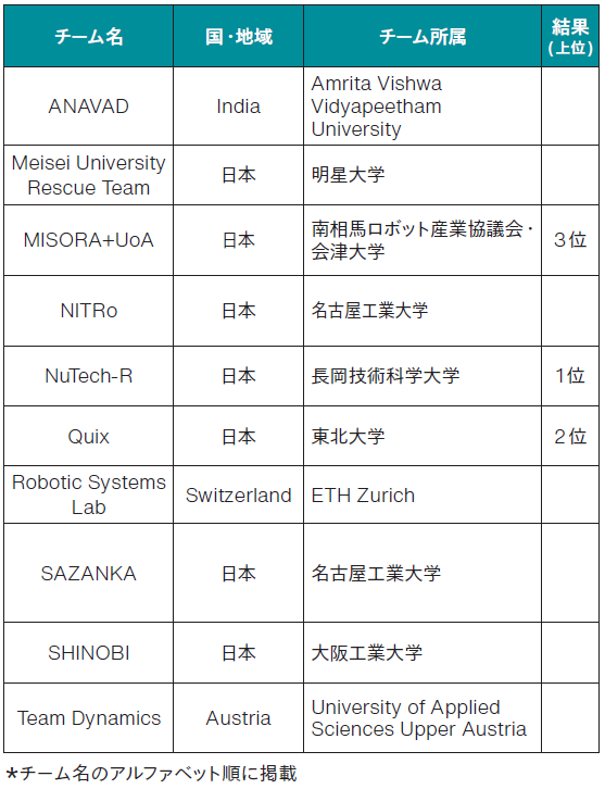 国内外から参加された全チームに、最大限の敬意と感謝を表する。長期間にわたる準備、創意工夫に満ちた技術開発、そして競技での真摯な取組みは、大会を成功に導く原動力となった。特に、限られた予算や人員の中で素晴らしい成果を上げた学生チームやスタートアップチームの努力は、称賛に値する。さらに、学生チームに献身的に研究開発の指導をされた指導教員の先生には、心から厚く御礼申し上げる。また、スタートアップチームにおかれては通常のビジネス以外の追加のお仕事に、開発費を工面していただき寝食を忘れてご尽力されたことを想像すると胸が熱くなる。是非とも、社会実装されて開発費の回収を、いや、新規ビジネスへの芽を創生して、大きなビジネスマイルストーンを描いていただきたく祈念したい。