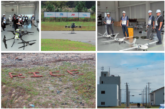 図6は浪江滑走路のパドックの様子、および、ミッション2のレンガで地表に書かれていた文字を判別した画像、そして、浪江滑走路から13㎞離れた福島ロボットテストフィールド(RTF)のミッション3エリアに到達したドローンの様子を示している。
