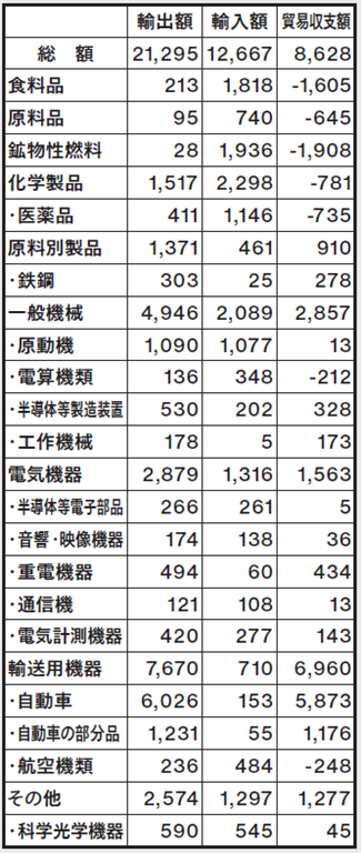 米国向けの輸出入は圧倒的に輸出額が輸入額を上回る(表1)。対米国の貿易収支額は8.6兆円。米国は自動車をはじめ機械類の多くで競争力が弱く、日本の自動車の貿易黒字が5.9兆円に達する。製造業で、米国が日本との貿易において競争力で優位にある製品は、化学製品(特に医薬品)、電算機類、航空機類である。ボイラやガスタービンなどの原動機も米国側に競争力があり、収支は均衡している。また、鉄鋼や工作機械の競争力も弱い。